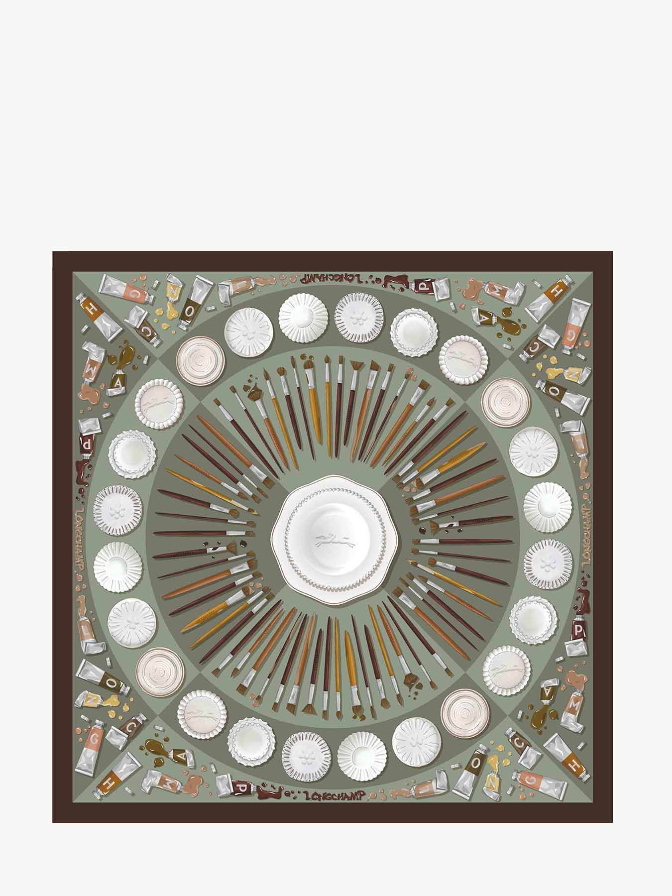 The 70x70 cm silk scarf ""Palette d’Artiste"" by Longchamp captures the very essence of artistic creation. Inspired by the vibrant world of the ceramist, this scarf showcases a rich palette of bright hues and delicate details such as scalloped porcelain plates, emblematic of the French art de vivre. Crafted from exceptional silk, this iconic accessory reflects Longchamp’s unique savoir-faire. Versatile and elegant, it can be worn gracefully around the neck, as a hair accessory, or tied at the waist to enhance and personalize your silhouette with a refined touch.